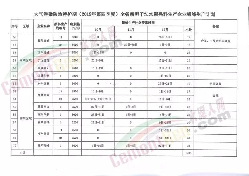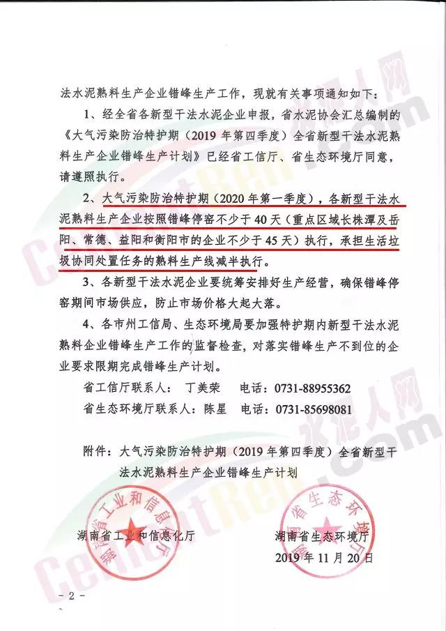 四季度日前,湖南省工信廳聯(lián)合生態(tài)環(huán)境廳發(fā)布《關于下達大氣污染防治特護期(2019年第四季度及2010年第一季度)全省新型干法水泥熟料生產(chǎn)企業(yè)錯峰生產(chǎn)計劃的通知》稱,根據(jù)湖南省政府印發(fā)的《湖南省“藍天保衛(wèi)戰(zhàn)”實施方案》(2018-2020年)“推進工業(yè)企業(yè)錯峰生產(chǎn)和運輸,繼續(xù)落實水泥行業(yè)錯峰生產(chǎn)要求”的有關精神以及原省經(jīng)信委、省環(huán)保廳《關于加強大氣污染防治特護期水泥行業(yè)錯峰生產(chǎn)和減排工作的通知》有關要求,為做好大氣污染防治特護期全省新型干法水泥熟料生產(chǎn)企業(yè)錯峰生產(chǎn)工作。其中2019年四季度按照協(xié)會編制的計劃執(zhí)行。2020年一季度各新型干法水泥熟料生產(chǎn)企業(yè)按照錯峰停窯不少于40天。重點區(qū)域長株潭及岳陽、常德 、益陽和衡陽市的企業(yè)不少于45天執(zhí)行。承擔垃圾協(xié)同處置任務的熟料生產(chǎn)線減半執(zhí)行。通知原文如下:
