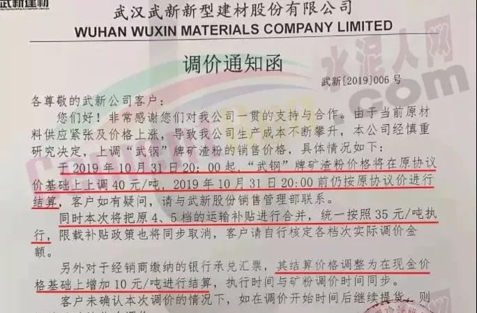 同期,武漢武新新型建材股份有限公司發(fā)調價通知上調“武鋼”礦渣粉價格40元/噸。
