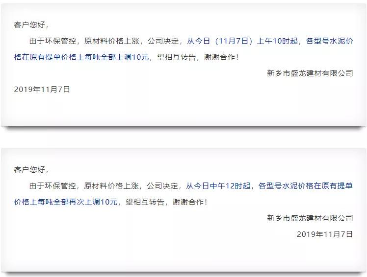 11月7日新鄉(xiāng)市盛龍建材有限公司一日內兩次發(fā)布調價通知,共上調20元/噸。自此拉開了河南區(qū)域本月連漲的序幕。