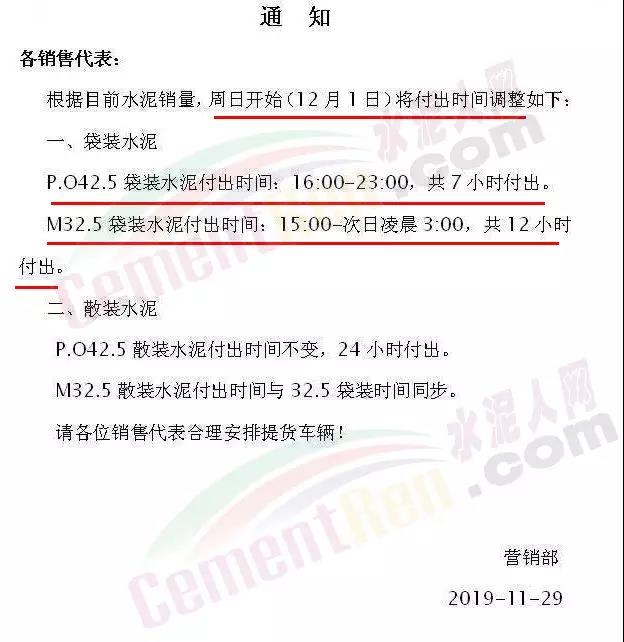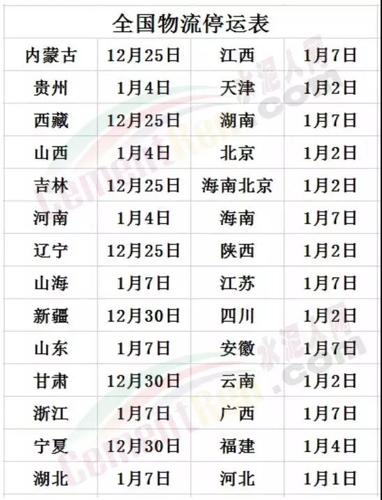 黑龍江處于冬季較寒冬地區(qū),每到冬季水泥企業(yè)發(fā)運部門都會調整發(fā)運時間,上年曾經有過隔日發(fā)運或夜間停發(fā)的通知。而每到年底物流行業(yè)都會通知調整發(fā)運時間和停運時間,今年也不例外。相比2019年,2020年的春節(jié)提早了11天。伴隨春節(jié)的提前,物流也將提前停運。據(jù)往年慣例,一般物流提前15-20天停運放假,這也意味著明年1月份僅一周左右的時間正常發(fā)貨,接下來的12月份將成為經銷商備貨的高峰期。2020年的春節(jié),受消費壓抑、品牌價格戰(zhàn)等因素影響,還將迎來一波搶購熱潮。對于經銷商而言,今年的備貨黃金周期在12月份。距離春節(jié)備貨不足20天,趁著還有時間,加緊備貨。近日,物流部門發(fā)布了河北、山東、江蘇、湖北、湖南、上海、安徽、內蒙古等27個省份地區(qū)春節(jié)期間物流停運通知。全國物流停運通知,從12月25日起就陸續(xù)停運了。時至年底,隨著天氣寒冷和最近霧霾天氣嚴重,物流部發(fā)出聲明,全國物流停運時間已經確定:內蒙古、西藏、吉林、遼寧等地12月25日停運;新疆、甘肅、寧夏等地12月30日停運;河北1月1日停運;天津、北京、陜西、四川、云南等地1月2日停運;福建、貴州、山西、河南等地1月4日停運;上海、山東、浙江、湖北、江西、湖南、海南、江蘇、安徽、廣西等地1月7日停運。