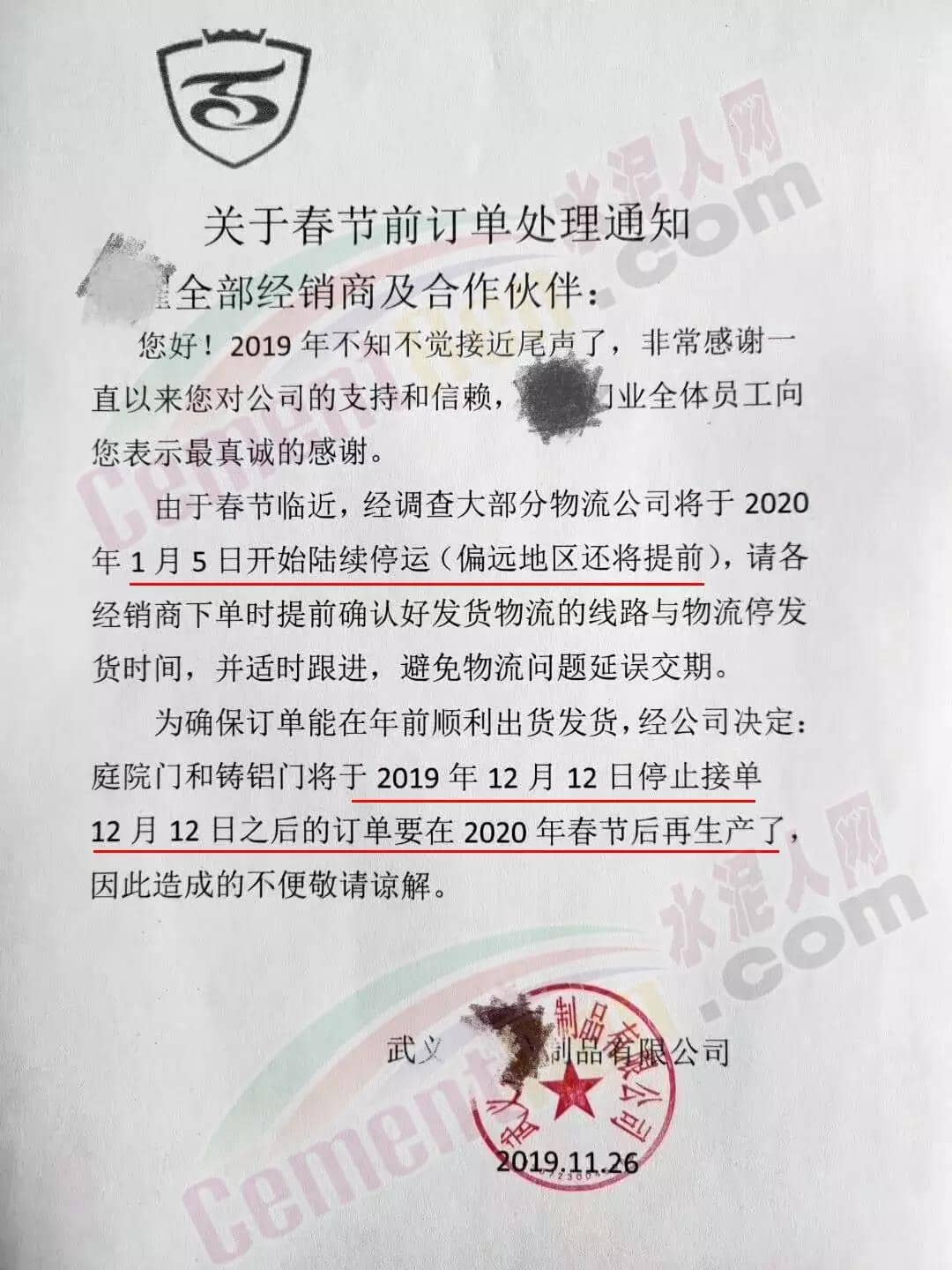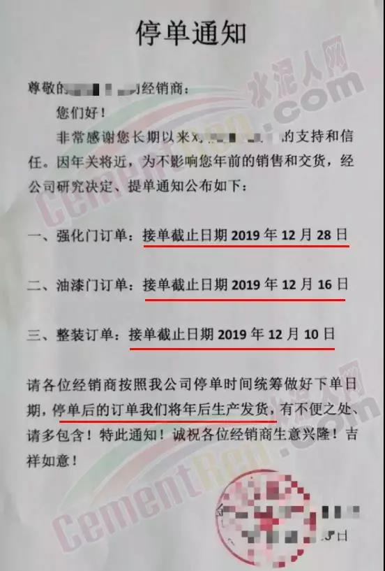 某企業(yè)停單通知接單截止日期為12月10日~28日,并表示停單后的訂單將在年后生產發(fā)貨。各企業(yè)停止接單通知多有明確年前要求生產交貨的所有訂單需在放假前安排全款發(fā)貨。