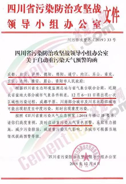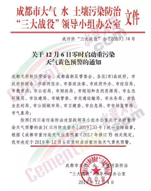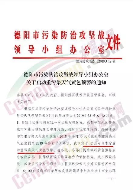 昨日(12月4日),四川省污染防治攻堅戰(zhàn)領(lǐng)導(dǎo)小組辦公室發(fā)布了“關(guān)于啟動重污染天氣預(yù)警的函”:根據(jù)四川省生態(tài)環(huán)境監(jiān)測總站與省氣象臺聯(lián)合會商,近期四川省盆地大部分城市氣象條件轉(zhuǎn)差,12月6日至11日將出現(xiàn)一次區(qū)域性天氣污染過程,成都平原、川南部分城市及川東北局部城市可能出現(xiàn)輕度至中度污染,短時出現(xiàn)重度污染。成都市大氣、水、土壤污染防治“三大戰(zhàn)役”領(lǐng)導(dǎo)小組辦公室發(fā)出通知,稱按照相關(guān)規(guī)定“成都市定于2019年12月6日零時啟動重污染天氣黃色預(yù)警。”這也是成都今冬首個重污染天氣黃色預(yù)警。