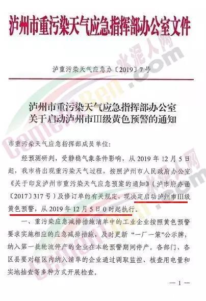 12月3日,四川省瀘州市重污染天氣應(yīng)急指揮部辦公室發(fā)布《關(guān)于啟動瀘州市Ⅲ級黃色預(yù)警的通知》。從2019年12月5日起,瀘州市將出現(xiàn)重污染天氣過程,按照瀘州市人民政府辦公室《關(guān)于印發(fā)瀘州市重污染天氣應(yīng)急預(yù)案的通知》(瀘市府辦函〔2017〕317號)及修訂單的有關(guān)規(guī)定,決定啟動瀘州市Ⅲ級黃色預(yù)警。
