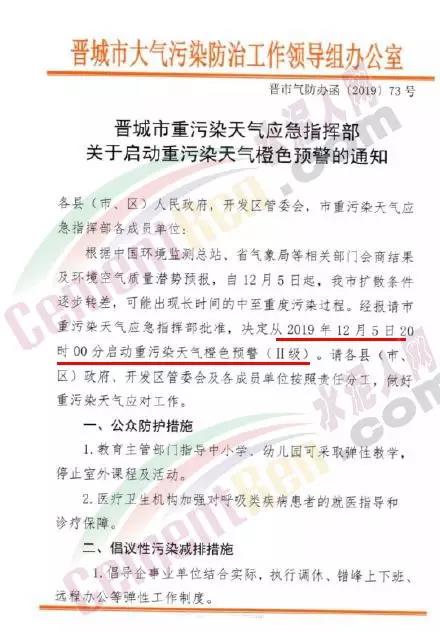 12月4日,,山西晉城市重污染天氣應(yīng)急指揮部辦公室發(fā)布《晉城市重污染天氣應(yīng)急指揮部關(guān)于啟動重污染天氣橙色預(yù)警的通知》,根據(jù)中國環(huán)境監(jiān)測總站,省氣象局等相關(guān)部門會商結(jié)果及環(huán)境空氣質(zhì)量潛勢預(yù)報,自12月5日起,晉城市擴(kuò)散條件逐步轉(zhuǎn)差,可能出現(xiàn)長時間的中至重度污染過程。經(jīng)報請市重污染天氣應(yīng)急指揮部批準(zhǔn),決定從2019年12月5日20:00啟動重污染天氣橙色預(yù)警(II級)。