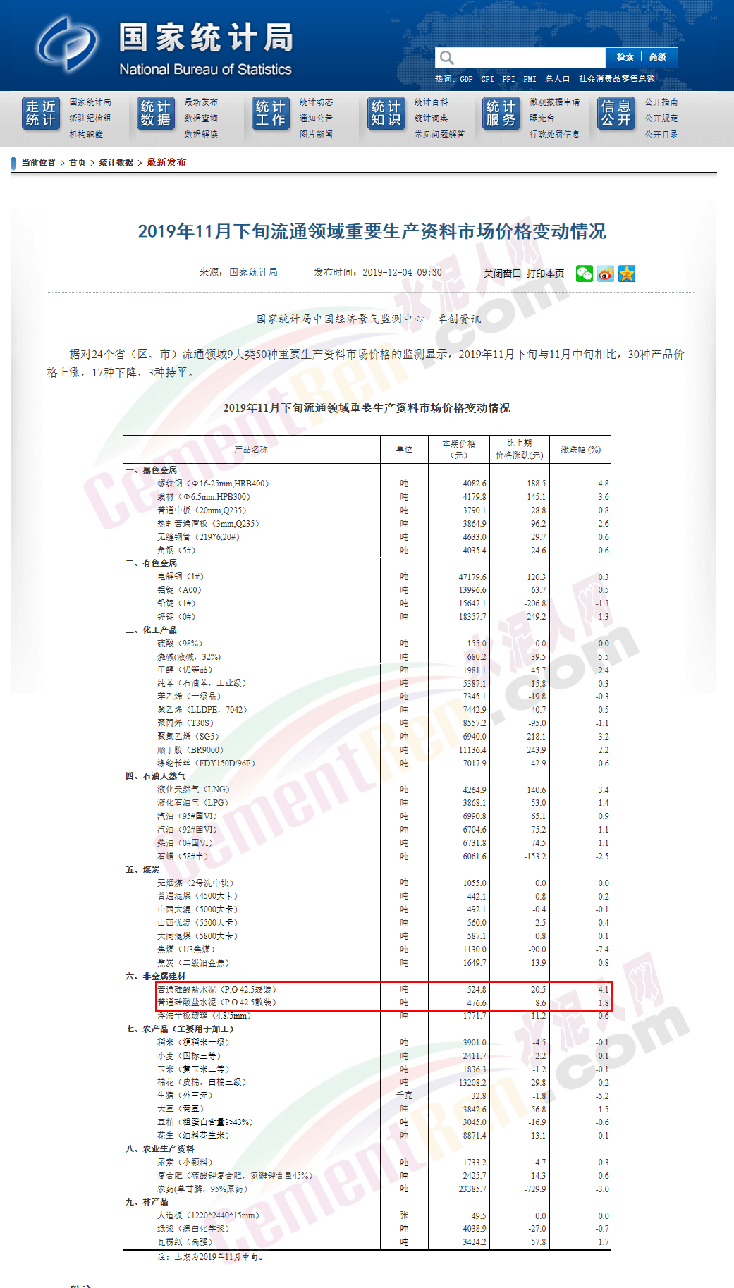 國家統(tǒng)計局近期對24個省(區(qū)、市)流通領域9大類50種重要生產資料市場價格的監(jiān)測數(shù)據顯示,2019年11月下旬與11月中旬相比,30種產品價格上漲,17種下降,3種持平。其中非金屬建材普通硅酸鹽水泥(P.O 42.5袋裝)均價524.8元/噸,較上期上漲20.5元/噸,漲幅4.1%;普通硅酸鹽水泥(P.O 42.5散裝)均價476.6元/噸,較上期上漲8.6元/噸,漲幅1.8%。這個價格已超過2018年的最高點,創(chuàng)2011年以來的最高價。