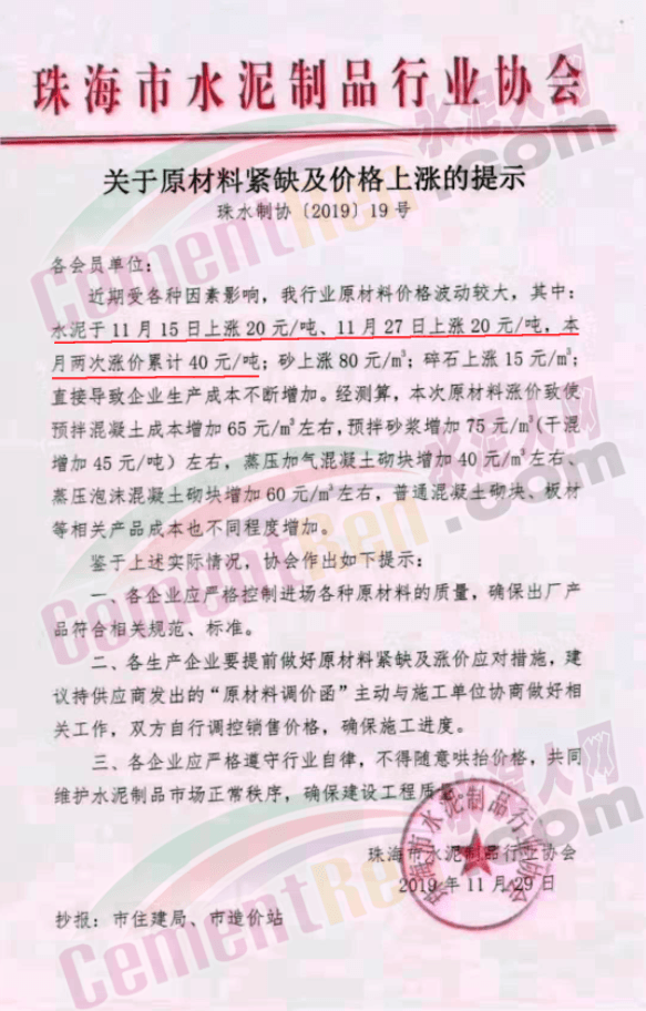 10月以來,廣東水泥經歷了六輪連漲,漲幅達100元/噸以上。珠海市水泥制品行業(yè)協(xié)會此前發(fā)布《關于原材料緊缺及價格上漲的提示》稱,水泥價格于11月15日上漲20元/噸、11月27日上漲20元/噸,一個月內累計上漲40元/噸。