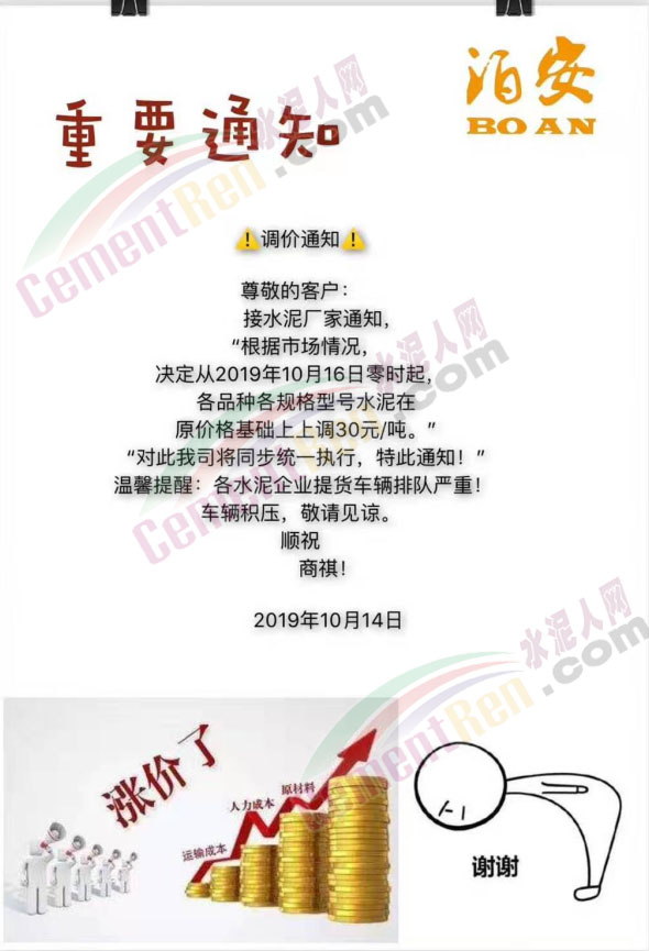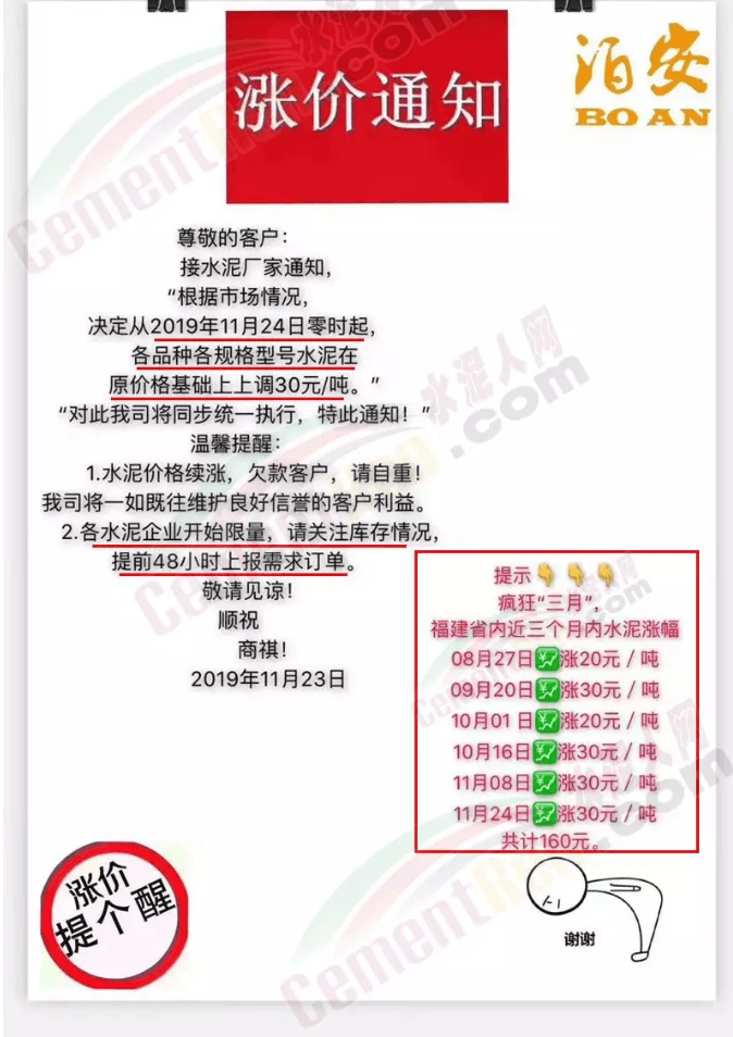 泊安水泥8月下旬至11月24日7連漲,累計漲價達到190元/噸。據了解更有甚者八月下旬至今8輪連漲,累計漲價達210元/噸。