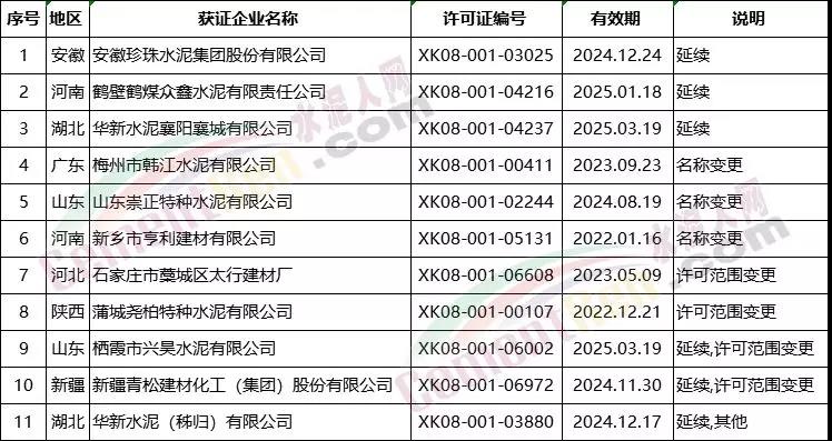 市場監(jiān)管總局全國工業(yè)產(chǎn)品生產(chǎn)許可證辦公室于12月1日發(fā)放本月第一批水泥企業(yè)生產(chǎn)許可證,涉及11個編號11家水泥生產(chǎn)企業(yè)。其中包括安徽珍珠水泥集團股份有限公司、鶴壁鶴煤眾鑫水泥有限責任公司、華新水泥襄陽襄城有限公司3家企業(yè)到期延續(xù);梅州市韓江水泥有限公司、山東崇正特種水泥有限公司、新鄉(xiāng)市亨利建材有限公司3家企業(yè)名稱變更;石家莊市藁城區(qū)太行建材廠、蒲城堯柏特種水泥有限公司、棲霞市興昊水泥有限公司、新疆青松建材化工(集團)股份有限公司4家企業(yè)許可范圍變更以及華新水泥(秭歸)有限公司涉及其他項目。