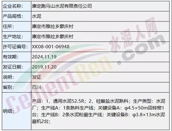 據(jù)了解,市場監(jiān)管總局全國工業(yè)產(chǎn)品生產(chǎn)許可證辦公室上個月共發(fā)放48個編號生產(chǎn)許可證,其中新發(fā)證書三個編號涉及兩家全能水泥廠和一家粉磨站。其中康定跑馬山水泥有限責任公司2500t/d熟料新型干法水泥生產(chǎn)線為今年 2019年4月下旬新點火生產(chǎn)線。涉及名稱變更及許可范圍變更的共18個編號。到期延續(xù)的共27個編號,發(fā)證日期均為2019年11月20日。