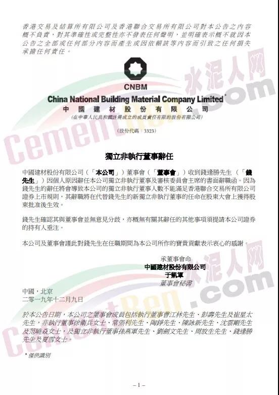 中國建材則公告表示,錢逢勝因個人原因辭任公司獨立非執(zhí)行董事及審核委員會主席的書面辭職函。
