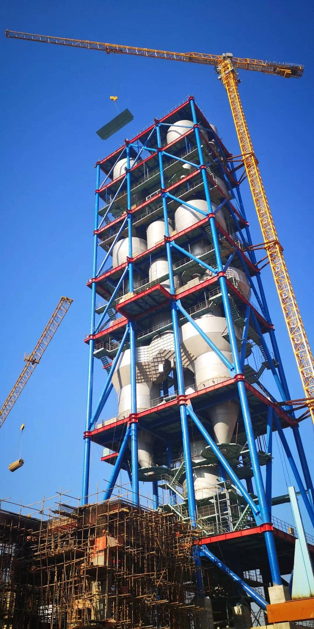回轉(zhuǎn)窯窯尾是項(xiàng)目建設(shè)中的最高建筑,主要包括預(yù)熱器、分解爐等大型設(shè)備,在整個(gè)工藝流程中擔(dān)負(fù)生料喂入旋風(fēng)筒、循環(huán)預(yù)熱分解后入窯的重要作用。8月18日貴州尖峰項(xiàng)目的設(shè)備安裝“第一吊”,也是從窯尾開(kāi)始的。