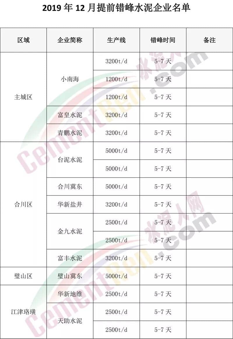 日前,重慶市水泥協(xié)會(huì)發(fā)布《重慶水泥行業(yè) 部分區(qū)域提前錯(cuò)峰的通知》(重水協(xié)【2019】30號(hào)文件)稱:為認(rèn)真貫徹市經(jīng)信委和市生態(tài)環(huán)境局聯(lián)合下發(fā)的《關(guān)于印發(fā)重慶市水泥行業(yè)錯(cuò)峰生產(chǎn)工作方案(2018-2020 年)的通知》(渝經(jīng)信法[2018]43號(hào))文件精神,同時(shí)按照重慶市大氣污染防治攻堅(jiān)戰(zhàn)指揮部《關(guān)于啟動(dòng) 2019年第十二次空氣污染應(yīng)對(duì)工作預(yù)警函》的要求,將對(duì)主城區(qū)、璧山區(qū)、合川區(qū)、江津珞璜地區(qū)實(shí)行提前錯(cuò)峰。提前錯(cuò)峰區(qū)域及企業(yè):主城區(qū)、璧山區(qū)、合川區(qū)、江津珞璜地區(qū)所有全能生產(chǎn)線。