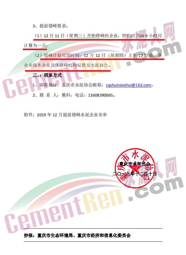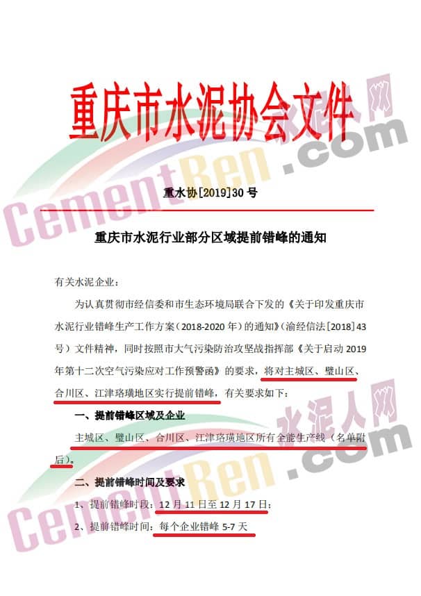 11月10日,重慶市水泥協(xié)會(huì)發(fā)布了《重慶水泥行業(yè)部分區(qū)域提前錯(cuò)峰的通知》稱,為認(rèn)真貫徹經(jīng)信委和市生態(tài)環(huán)境局聯(lián)合下發(fā)的《關(guān)于印發(fā)重慶市水泥行業(yè)錯(cuò)峰生產(chǎn)工作方案(2018-2020年)的通知》(渝經(jīng)信法[2018]43號(hào))文件精神,同時(shí)按照市大氣污染防治攻堅(jiān)戰(zhàn)指揮部《關(guān)于啟動(dòng)2019年第十二次空氣污染應(yīng)對(duì)工作預(yù)警函》的要求,對(duì)主城區(qū)、璧山區(qū)、合川區(qū)、江津珞璜地區(qū)實(shí)行提前錯(cuò)峰,提前錯(cuò)峰時(shí)段為12月11日至12月17日,每個(gè)企業(yè)錯(cuò)峰5至7天。具體如下: