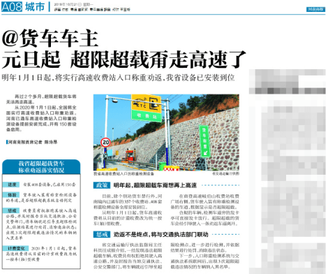 河南商報(bào)也發(fā)布了關(guān)于超限超載通知,明年1月1日起,將實(shí)行高速收費(fèi)站入口稱重勸返,目前,除個(gè)別站貨車禁行外,河南境內(nèi)已通車的357個(gè)收費(fèi)站、408套稱重檢測(cè)設(shè)備全部安裝到位。
