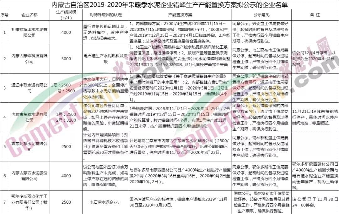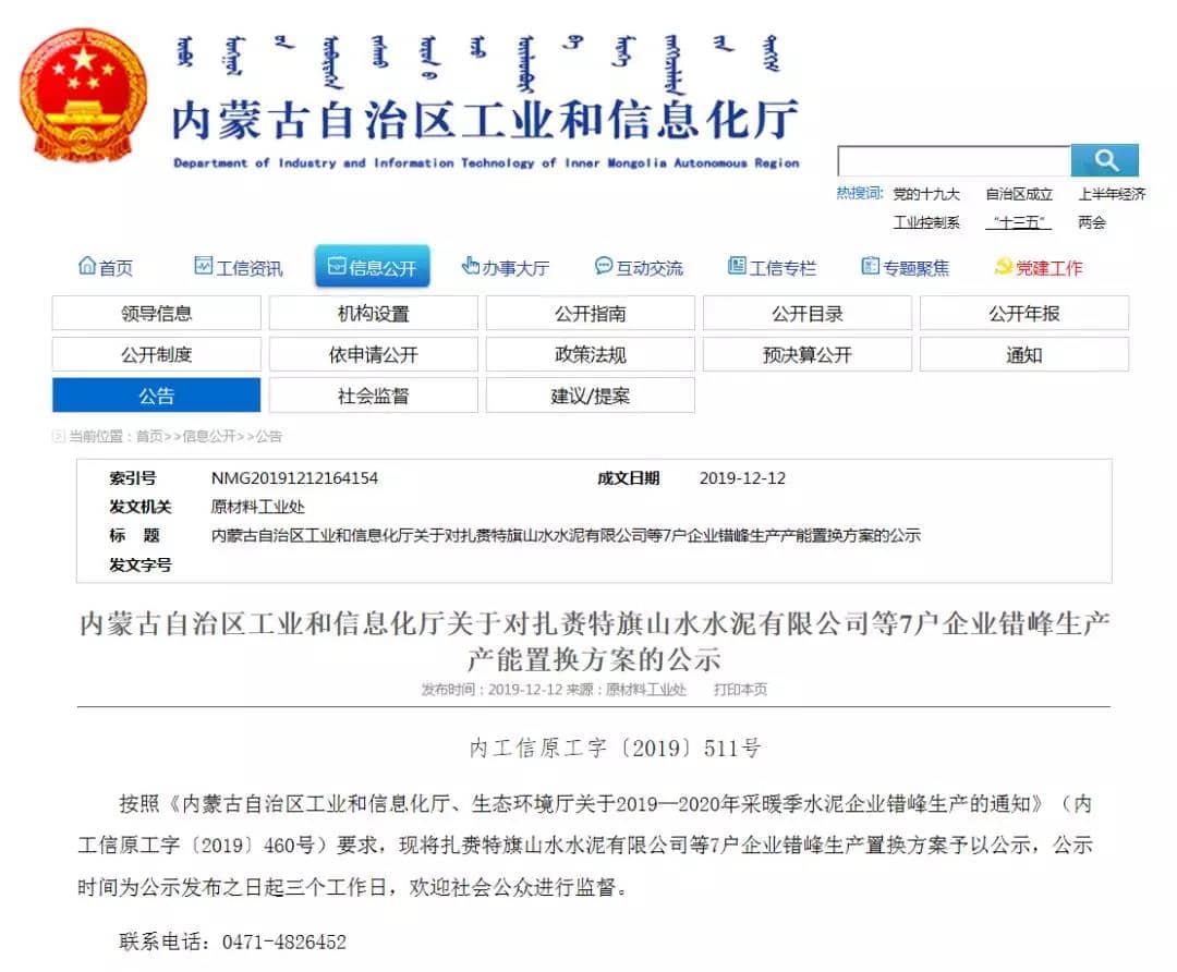 12月12日,內(nèi)蒙古自治區(qū)工業(yè)和信息化廳《內(nèi)蒙古自治區(qū)工業(yè)和信息化廳關于對扎賚特旗山水水泥有限公司等7戶企業(yè)錯峰生產(chǎn)產(chǎn)能置換方案的公示》。