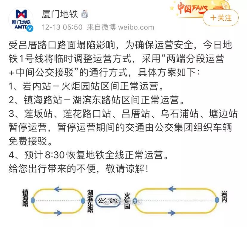 關(guān)于此次呂厝地陷導(dǎo)致水管破裂的事故,2019年12日23時(shí)50分左右,廈門日?qǐng)?bào)從廈門水務(wù)集團(tuán)獲悉,該集團(tuán)已通過雙回路的另外一路管道供水,市區(qū)水壓已經(jīng)逐步恢復(fù)。截至13日1時(shí),各項(xiàng)措施正在推進(jìn)中,正組織專家對(duì)事故原因進(jìn)行調(diào)查。今天5:50,@廈門地鐵 再次發(fā)布消息,受呂厝路口路面塌陷影響,廈門地鐵1號(hào)線臨時(shí)調(diào)整運(yùn)營(yíng)方式,蓮坂站、蓮花路口站、呂厝站、烏石浦站、塘邊站暫停運(yùn)營(yíng),暫停運(yùn)營(yíng)期間的交通由公交集團(tuán)組織車輛免費(fèi)接駁。預(yù)計(jì)8:30恢復(fù)地鐵全線正常運(yùn)營(yíng)。