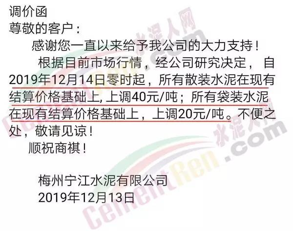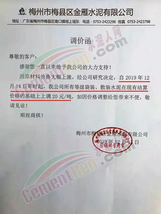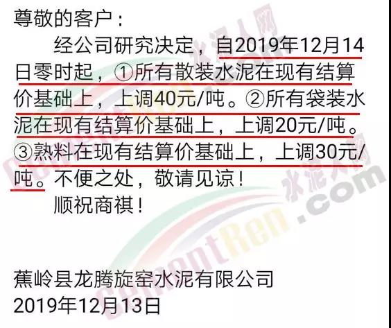 感謝您一直以來對我司的大力支持、根據(jù)目前市場行情,經(jīng)公司研究決定,自2019年12月14日6時(shí)起,我司發(fā)往各區(qū)域的全部品牌各規(guī)格袋、散裝水泥的出廠價(jià)格上調(diào)30元/噸。