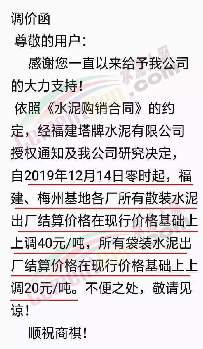 根據(jù)市場情況,經(jīng)研究,決定從2019年12月14日零時(shí)起,本公司發(fā)往福建省內(nèi)各品種各規(guī)格型號(hào)水泥在原價(jià)格基礎(chǔ)上上調(diào)30元/噸。