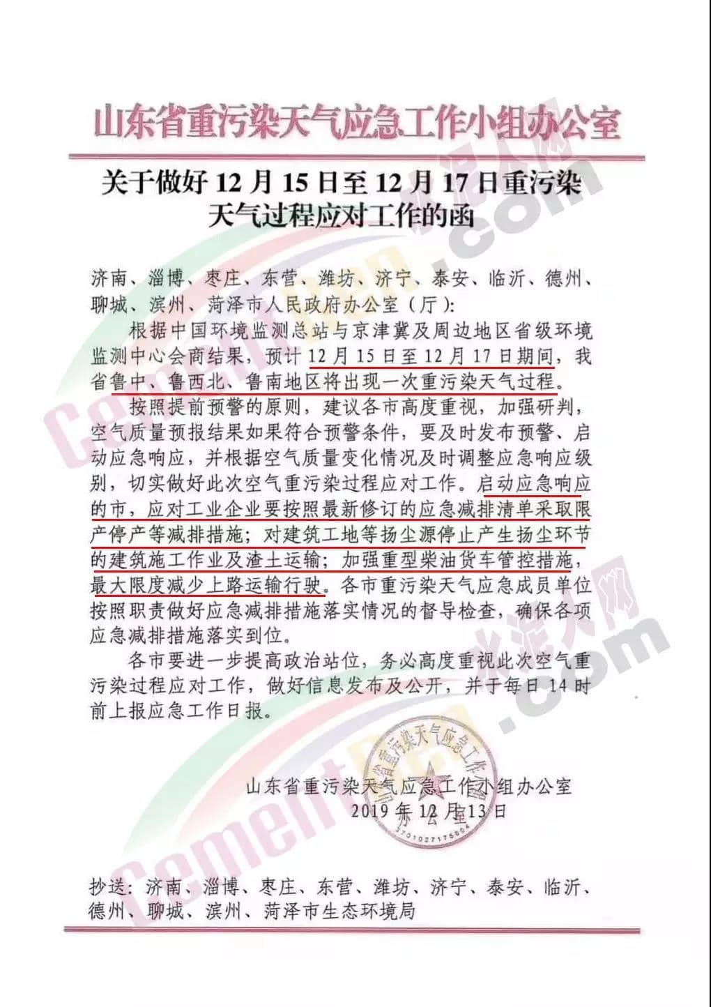 日前,山東省重污染天氣應急工作小組辦公室發(fā)布《關(guān)于做好12月15日至12月17日重污染天氣過程應對工作的函》稱提到12月15日至12月17日期間山東省魯中、魯西北、魯南地區(qū)將出現(xiàn)一次重污染天氣過程 。按照提前預警的原則,建議濟南、淄博、棗莊、東營、濰坊、濟寧、泰安、臨沂、德州、聊城、濱州、荷澤市12個城市,高度重視并加強研判,空氣質(zhì)量預報結(jié)果如果符合預警條件,要及時發(fā)布預警、啟動應急響應,并根據(jù)空氣質(zhì)量變化情況及時調(diào)整應急響應級別,切實做好此次空氣重污染過程應對工作。此次預警,山東省300多家水泥熟料和粉磨站企業(yè)將要面臨新一輪的停限產(chǎn)。