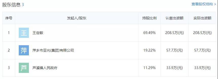 相關(guān)數(shù)據(jù)顯示江西日江水泥制造有限公司疑似實(shí)際控制人王定敏擁有企業(yè)69.49%的股份,為第一大股東;第二大股東為萍鄉(xiāng)市亞光(集團(tuán))有限公司,占股19.22%。第三大股東為蘆溪鎮(zhèn)人民政府,占股11.29%。