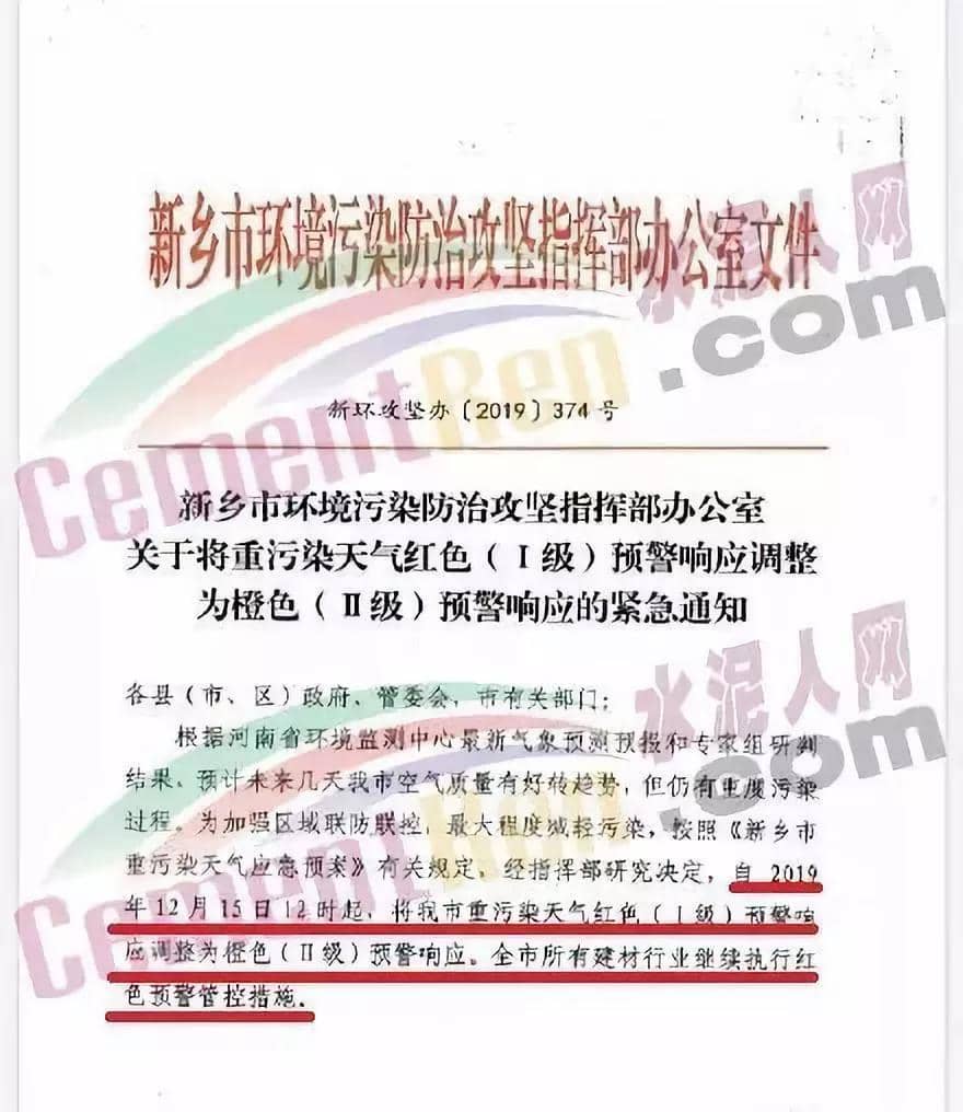 日前,新鄉(xiāng)市環(huán)境防治攻堅指揮部辦公室又發(fā)一文稱,自12月15日12時起,將新鄉(xiāng)市重污染天氣紅色預警(I級)降至橙色預警(II級),但是全市所有建材行業(yè)企業(yè)仍舊繼續(xù)執(zhí)行紅色預警管控措施。