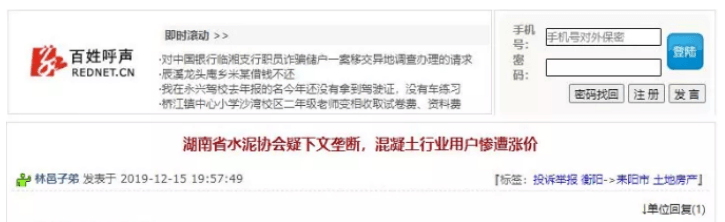 日前,湖南省地方新聞網(wǎng)站紅網(wǎng)《百姓呼聲》欄目刊載耒陽市八家商品混凝土公司的聯(lián)名投訴水泥廠連續(xù)四個月對水泥漲價110元/噸。從七月份起的350元/噸漲到460元/噸。與相鄰區(qū)域差價85元/噸。市場監(jiān)督管理局將介入調查。