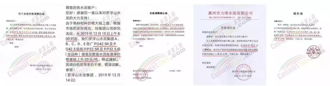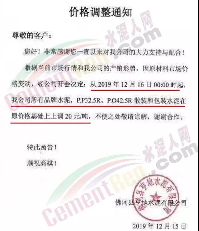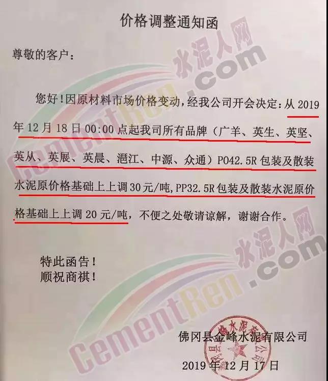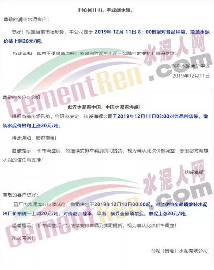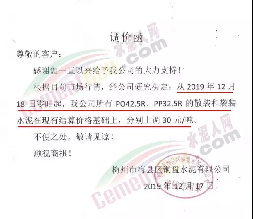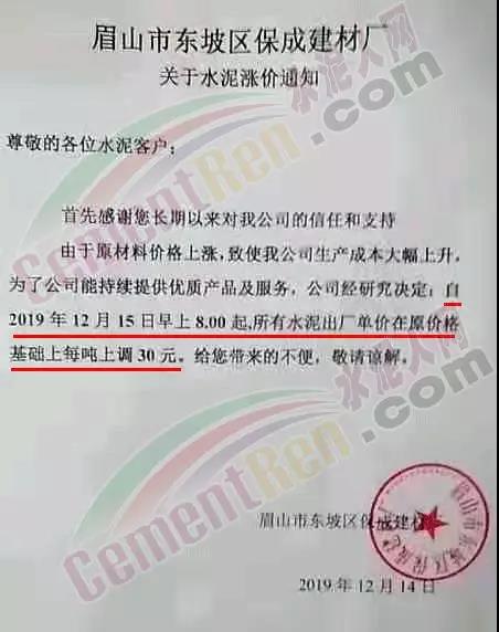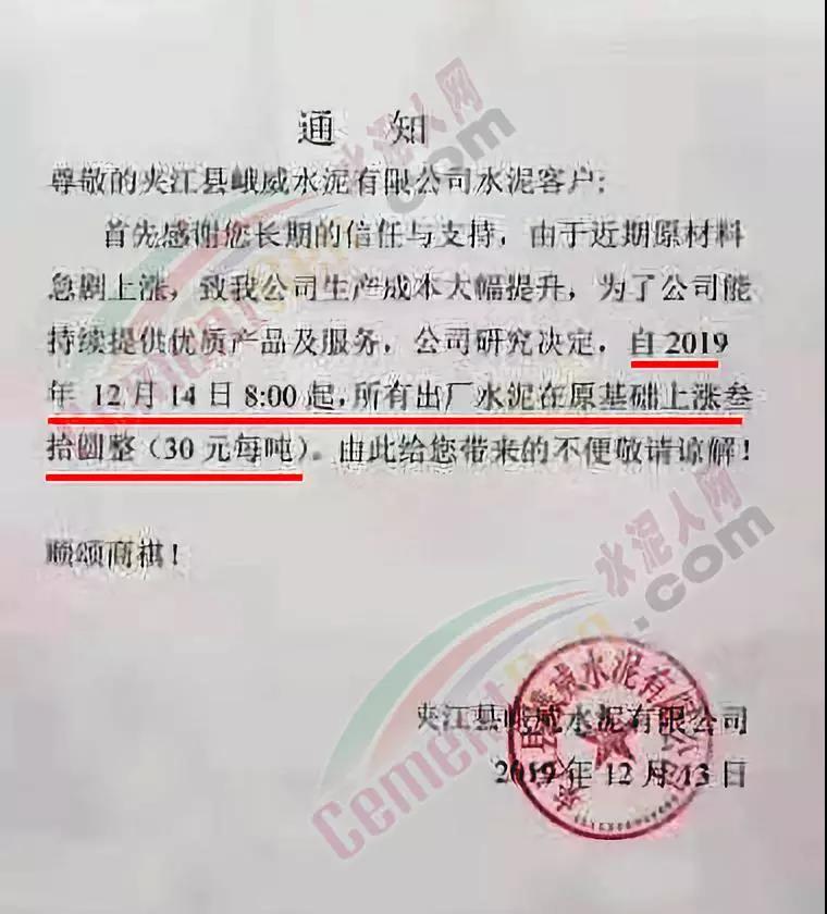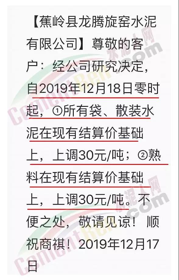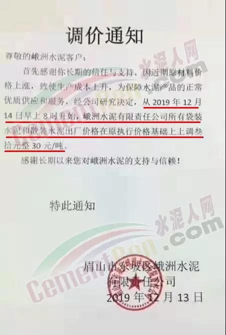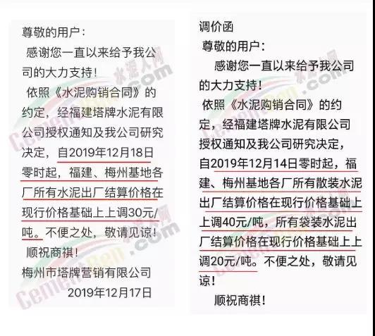 期中,梅州市塔牌營銷通知稱依照《水泥購銷合同》的約定,經(jīng)福建塔牌水泥有限公司授權通知及我公司研究決定,自2019年12月18日零時起,福建、梅州基地各廠所有水泥出廠結算價格在現(xiàn)行價格基礎上上調30元/噸。上周六(14日),這家企業(yè)剛剛通知福建、梅州各基地各廠所有散裝水泥出廠結算價格在現(xiàn)行價格基礎上上調40元/噸,所有袋裝水泥出廠結算價格在現(xiàn)行價格基礎上上調20元/噸。