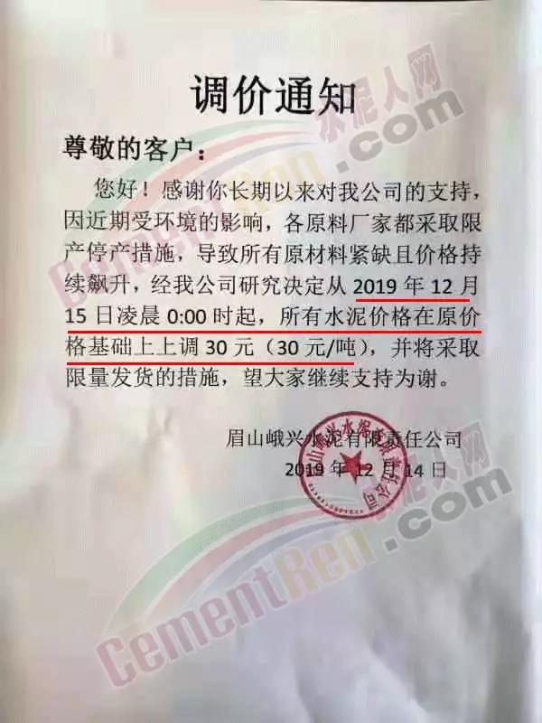 不僅廣東區(qū)域,近期四川眉山市、樂山市區(qū)域多家企業(yè)集體上調水泥價格。其中眉山峨興水泥有限責任公司調價通知稱,因近期受環(huán)境影響,各原料廠家都采取限產(chǎn)停產(chǎn)措施,導致所有原材料緊缺且價格持續(xù)飆升,經(jīng)公司研究決定從12月15日凌晨0點起,所有水泥價格在原價基礎上上調30元/噸,并將采取限量發(fā)貨措施。