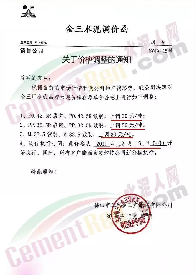 廣東區(qū)域,佛山金三水泥通知,根據(jù)當(dāng)前的市場行情結(jié)合公司的產(chǎn)銷形勢,決定自今日(19日)0時起對金三廠全線品牌水泥在原單價基礎(chǔ)上上調(diào)20元/噸。