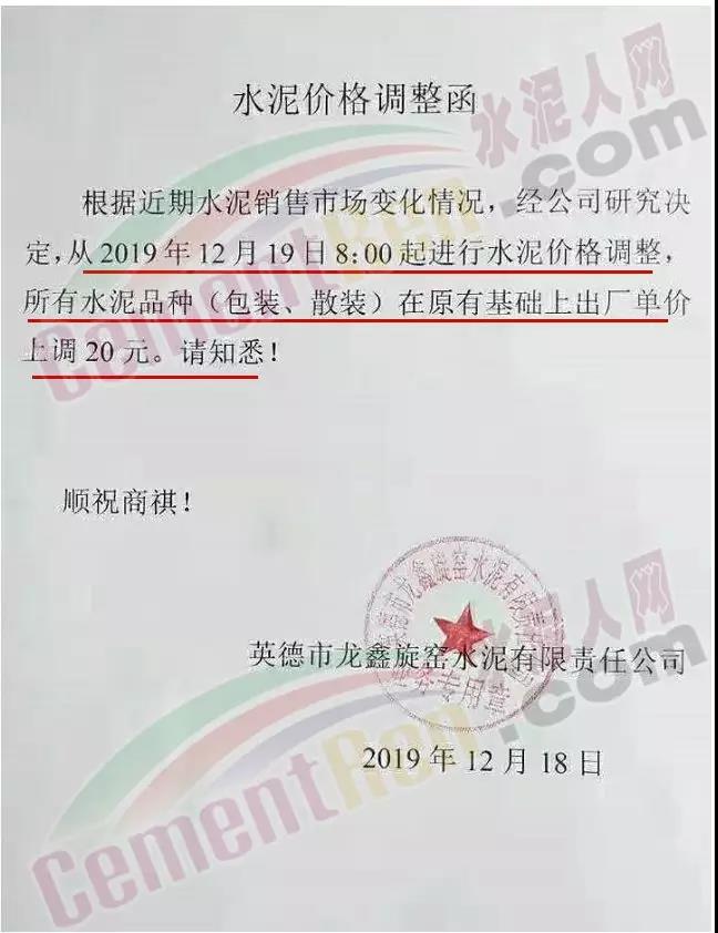 排隊船昨日(18日),四川區(qū)域各企業(yè)也通知上調(diào)水泥格30-40元/噸。其中長寧紅獅水泥調(diào)價通知稱,根據(jù)市場銷售情況,經(jīng)研究決定 從12月18日上午7時起,長寧紅獅生產(chǎn)的各規(guī)格包裝水泥合同價上調(diào)30元/噸,散裝水泥合同價上調(diào)40元/噸。