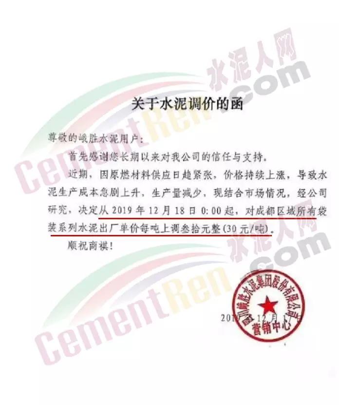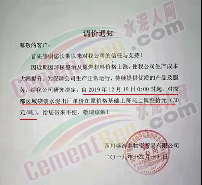 四川盛浩泰物資貿(mào)易有限公司調(diào)價通知稱,自12月18日零時起,對成都區(qū)域袋裝水泥出廠單價在原價格基礎(chǔ)上上調(diào)30元/噸。