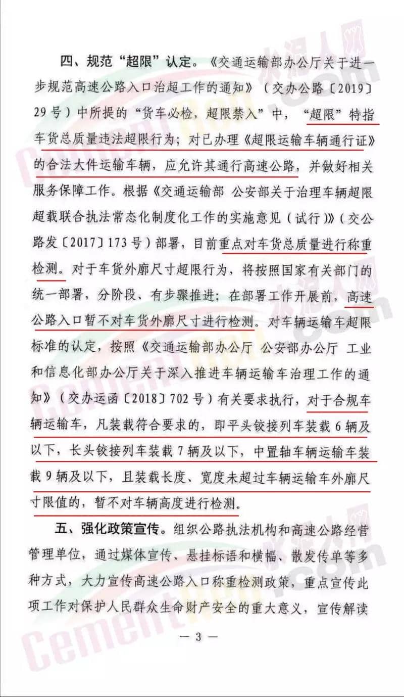對于車貨外廓尺寸超限行為,將按照國家有關(guān)部門的統(tǒng)一部署,分階段、有步驟推進(jìn);在部署工作開展前,高速公路入口暫不對車貨外廓尺寸進(jìn)行檢測。對車輛運(yùn)輸超限標(biāo)準(zhǔn)的認(rèn)定,按照《交通運(yùn)輸 部辦公室廳 公安部辦公室廳 工業(yè)和信息化部辦公室廳關(guān)于深入推進(jìn)車輛運(yùn)輸車治理工作的通知》(交辦運(yùn)【2018】702號)有關(guān)要求執(zhí)行,對于合規(guī)車輛運(yùn)輸車,凡裝載符合要求的,即平頭鉸接列車裝載6輛及以下,長頭鉸接列車裝載7輛及以下,中置軸車輛運(yùn)輸車裝載9輛及以下,且裝載長度、寬度未超過車輛運(yùn)輸車外廓尺寸限值的,暫不對車輛高度進(jìn)行檢測。