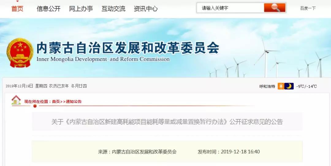 12月18日,內(nèi)蒙古自治區(qū)發(fā)展和改革委員會(huì)發(fā)布了《關(guān)于內(nèi)蒙古自治區(qū)新建高耗能項(xiàng)目能耗等量或減量置換暫行辦法公開(kāi)征求意見(jiàn)的公告》稱(chēng),為控制全區(qū)能源消費(fèi)過(guò)快增長(zhǎng),提高能源利用效率,依據(jù)相關(guān)政策制定《內(nèi)蒙古自治區(qū)新建高耗能項(xiàng)目能耗等量或減量置換暫行辦法》。