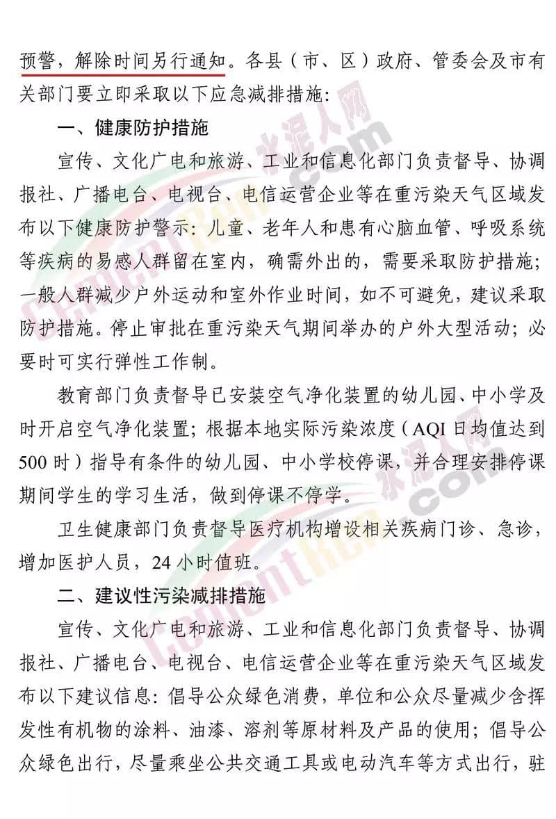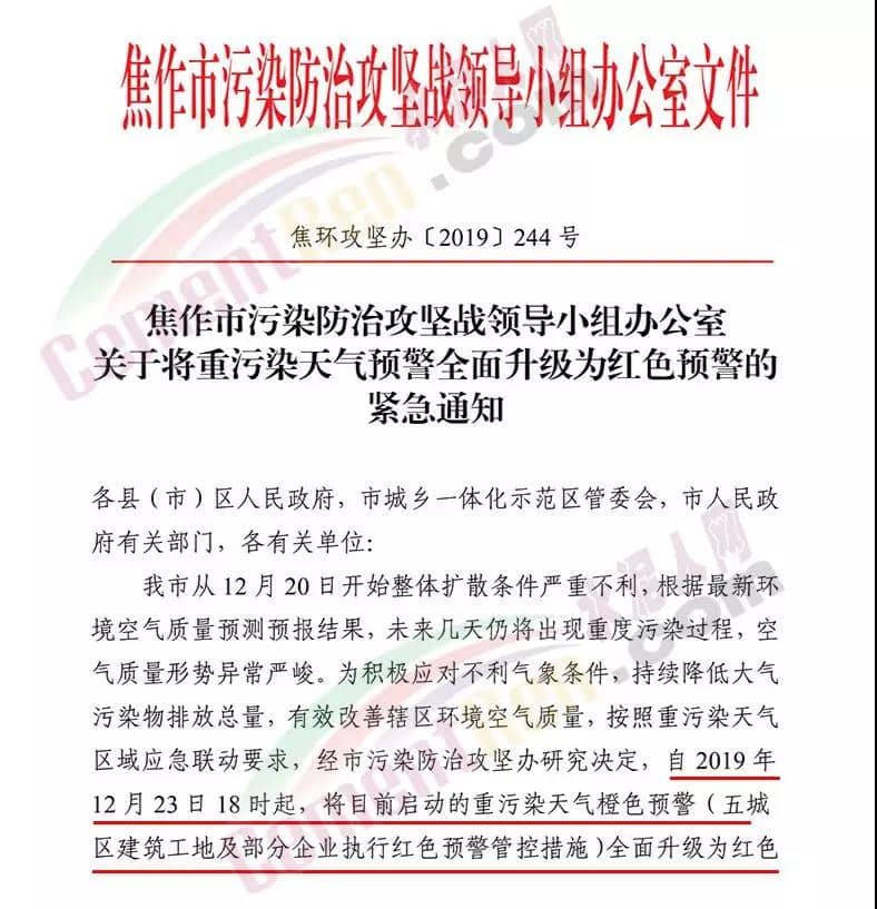 昨日(12月23日)河南省焦作市污染防治攻堅戰(zhàn)領導小組辦公室印發(fā)《關于將重污染天氣預警全面升級為紅色預警的 緊急通知》稱,焦作市自 2019 年 12 月 23 日 18 時起,將目前啟動的重污染天氣橙色預警(五城 區(qū)建筑工地及部分企業(yè)執(zhí)行紅色預警管控措施)全面升級為紅色預警,解除時間另行通知。工業(yè)源減排措施 各縣(市)區(qū)人民政府、市城鄉(xiāng)一體化示范區(qū)管委會應當按照重污染天氣預警要求,實施Ⅰ級應急響應,嚴格落實所在轄區(qū)重污染天氣應急減排措施清單中的紅色預警停、限產措施。對不可臨時中斷的生產線或生產工序,相關企業(yè)應調整生產計劃,確 保生產安全運行的前提下,實施最大限度的污染物減排措施。工業(yè)和信息化、生態(tài)環(huán)境等部門按照職能分工負責督導重點行業(yè)、 非重點行業(yè)、小微涉氣行業(yè)等工業(yè)企業(yè),按照“一廠一策”,采取 降低生產負荷、停產、加強污染治理、實施大宗物料錯峰運輸等 措施,減少大氣污染物排放量。預警期間,嚴禁工業(yè)企業(yè)新開生產線或運行新的生產設備, 生產負荷不得超過預警前期生產負荷;長期停產及未建成企業(yè)復 產或試生產前,須向縣(區(qū))、市兩級污染防治攻堅辦報告,經同意后方可進行。揚塵源減排措施 礦山、砂石料廠、石材廠、石板廠等應停止露天作業(yè);施工 工地停止室外作業(yè)。建筑垃圾清運車輛和砂石運輸車輛禁止上路行駛。開挖土石方的挖掘機等非道路移動機械停止作業(yè)。通知原文如下: