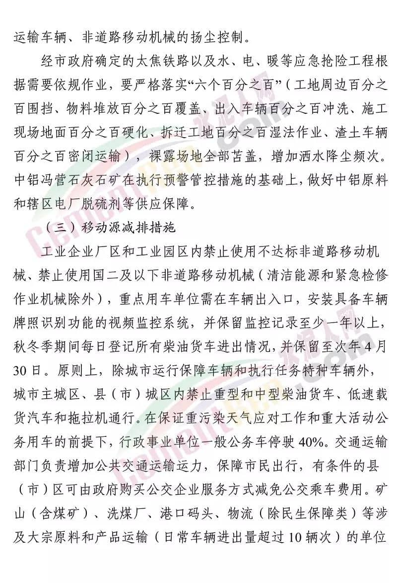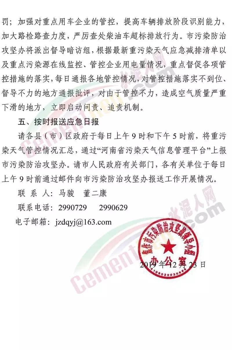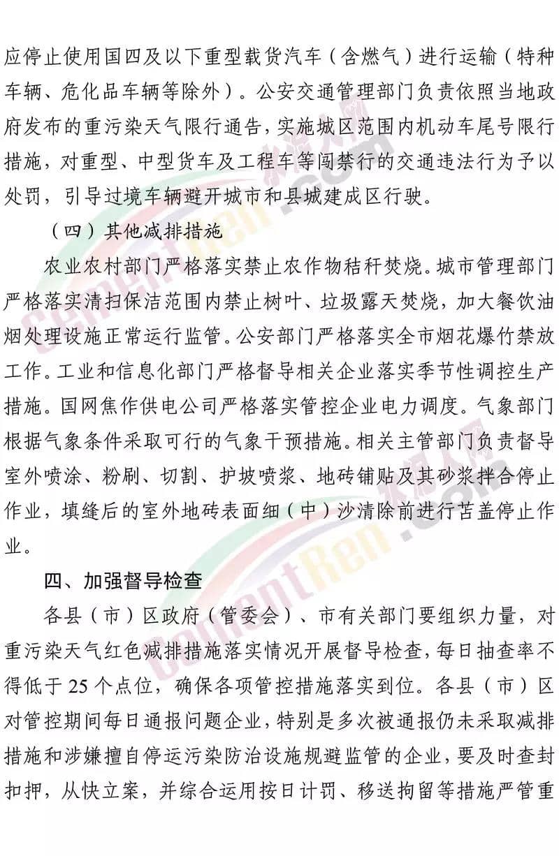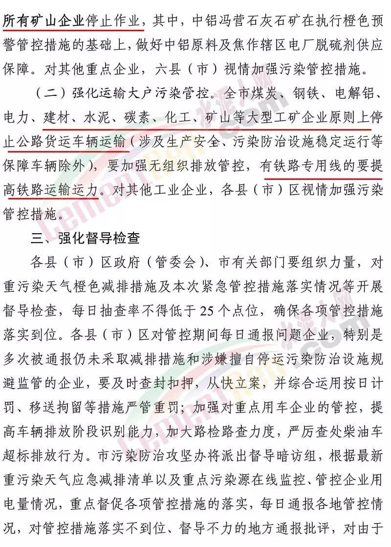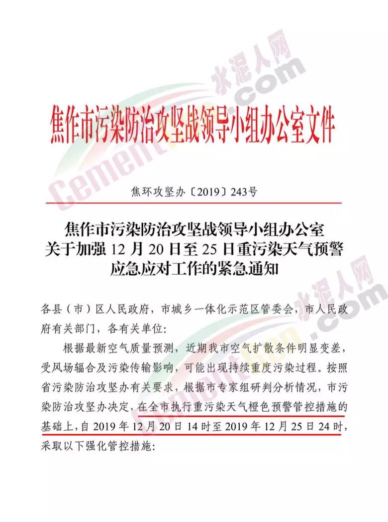 據了解,12 月 19 日焦作市污染防治攻堅戰(zhàn)領導小組辦公室 曾發(fā)布《關于加強 12 月 20 日至 25 日重污染天氣預警 應急應對工作的緊急通知》要求在全市執(zhí)行重污染天氣橙色預警管控措施的 基礎上,自 2019 年 12 月 20 日 14 時至 2019 年 12 月 25 日 24 時, 采取以下強化管控措施強化工地揚塵污染管控。五城區(qū)范圍內各類建設工程(含混凝土攪拌站)要嚴格落實重污染天氣紅色預警管控措施,紅色預警期間允許作業(yè)的重大民生工程和重點項目,要依法依規(guī)施工作業(yè)。強化污染排放大戶管控。水泥粉磨站(焦作堅固水泥有限公司、 焦作千業(yè)水泥有限責任公司、焦作市中晶水泥有限責任公司、焦作市賽雪白水泥有限公司、博愛金隅水泥有限公司、沁陽市金隅水泥有限公司、焦作市鵬遠水泥有限公司、焦作市永石水泥廠、 沁陽市太華建材有限公司、焦作市丹陽水泥有限公司)。全市所有礦山企業(yè)停止作業(yè)。強化運輸大戶污染管控。全市煤炭、鋼鐵、電解鋁、 電力、建材、水泥、碳素、化工、礦山等大型工礦企業(yè)原則上停止公路貨運車輛運輸(涉及生產安全、污染防治設施穩(wěn)定運行等 保障車輛除外),要加強無組織排放管控,有鐵路專用線的要提高鐵路運輸運力。對其他工業(yè)企業(yè),各縣(市)區(qū)視情加強污染 管控措施。通知原文如下: