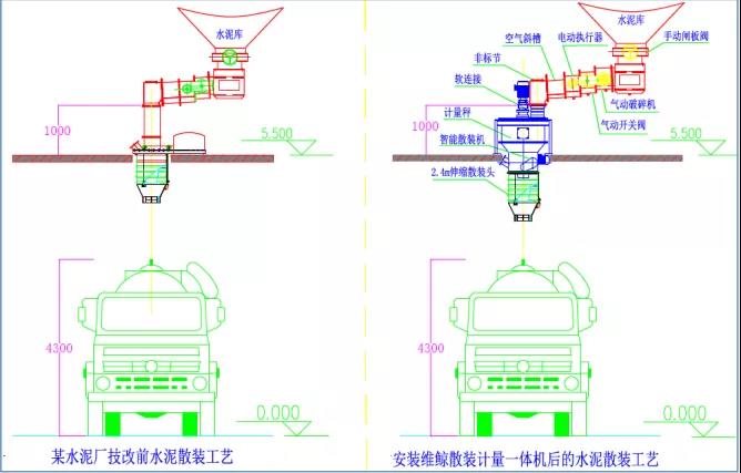 如下圖案例所示,水泥出料口到散裝機法蘭高度低于0.5米,目前大部分散裝平臺高度在5.5m以上,散裝罐車多數(shù)在4.3m以下。所有通過式散裝計量設備至少要求斜槽出料口到散裝機法蘭高度在1m以上。我公司將傳統(tǒng)平臺安裝的散裝機改為可以靈活布置的新型散裝機,并利用原有散裝機的高度和散裝平臺下方高度來完成定量散裝的技術改造。