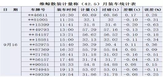 維鯨散裝計量秤目前已在水泥生產(chǎn)企業(yè)中有多個應用案例,取得良好的應用效果,以2019在安徽某水泥生產(chǎn)企業(yè)的實測數(shù)據(jù)記錄為例,可以看出使用該系統(tǒng)后的計量精度均保持在1%以內(nèi),在一個月內(nèi)無返車打料或加裝的現(xiàn)象,完全可達到一次裝車完成無超載出廠的情況。