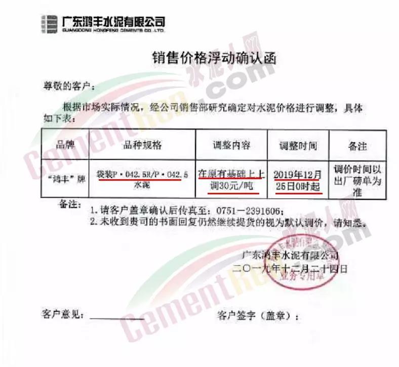 日前,廣東匯豐水泥有限公司通知水泥銷售價格浮動,“鴻豐”牌袋裝PO42.5/PO42.5水泥自12月25日0時起在原價基礎(chǔ)上上調(diào)30元/噸,調(diào)價時間以出廠磅單為準。