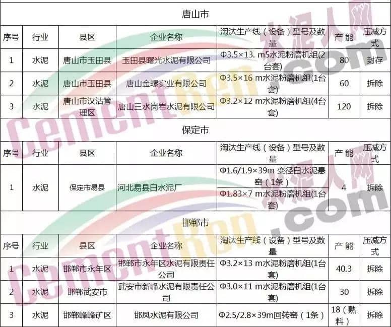 從上表可見河北省唐山市3家水泥企業(yè)、保定市1家水泥企業(yè)、邯鄲市3家水泥企業(yè)、2臺(tái)套水泥粉磨機(jī)組被封存8臺(tái)套水泥粉磨機(jī)組被拆除,2臺(tái)懸窯回轉(zhuǎn)窯被拆除,淘汰產(chǎn)能合計(jì)352.3萬噸。