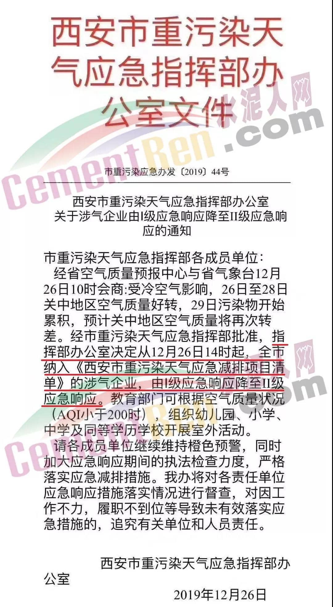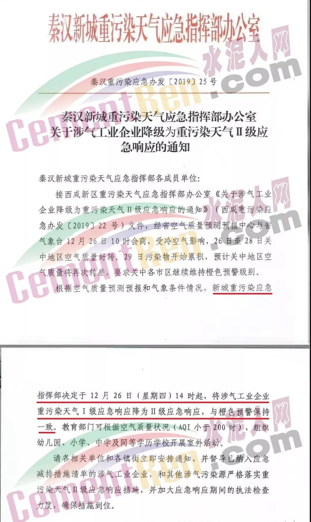 12月26日,陜西省西安市重污染天氣應急指揮部辦公室發(fā)布了《關于涉氣企業(yè)由I級應急響應降至II級應急響應的通知》稱,西安市指揮部辦公室定于12月26日14時起,全西安市納入《西安市重污染天氣應急減排項目清單》的涉氣企業(yè),由I級應急響應降至II級應急響應。通知原文如下: