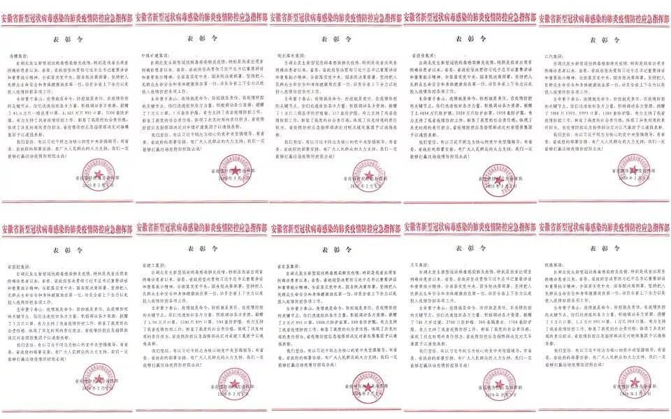 2月1日,省疫情防控應(yīng)急指揮部對相關(guān)省屬企業(yè)頒發(fā)表彰令,對海螺集團(tuán)、中煤礦建集團(tuán)、皖北煤電集團(tuán)、省投資集團(tuán)、江汽集團(tuán)、省國控集團(tuán)、建工集團(tuán)、省農(nóng)墾集團(tuán)、叉車集團(tuán)、皖維集團(tuán)等10戶省屬企業(yè)進(jìn)行了通報表彰。