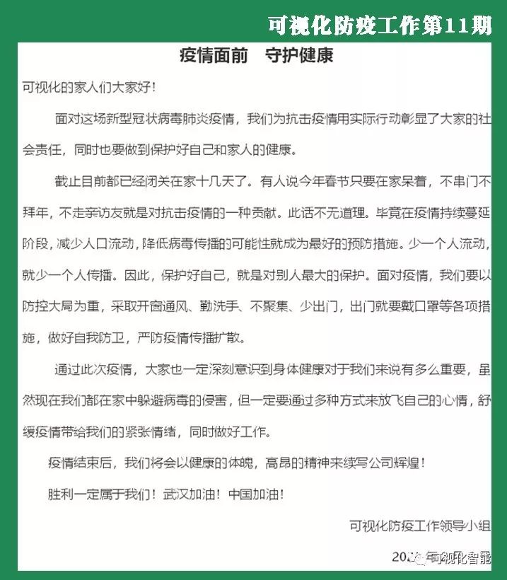 近日,新型冠狀病毒引起的肺炎疫情牽動著全國人民的心,北京可視化智能科技股份有限公司(以下簡稱:北京可視化智能科技)在密切關注疫情發(fā)展情況的同時,積極采取相應措施,打好防疫攻堅戰(zhàn)做好充足準備。