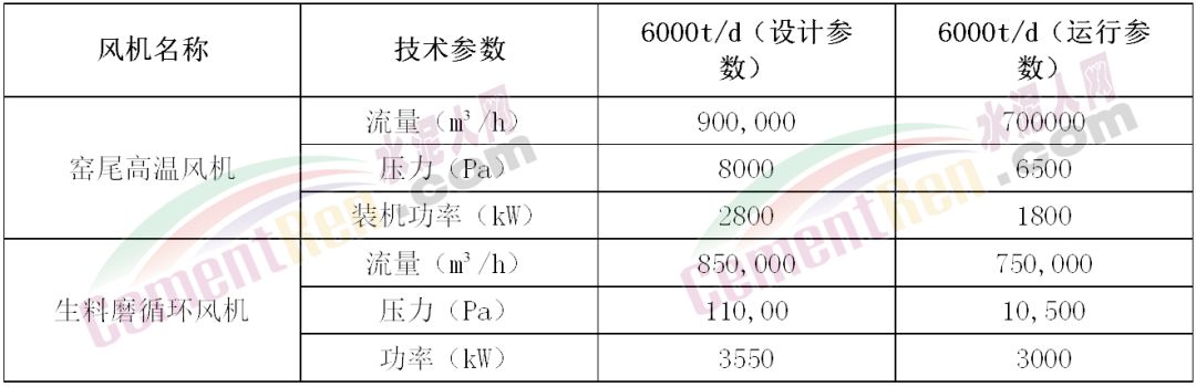 而風(fēng)機(jī)設(shè)計(jì)參數(shù)余量系數(shù)過大,則實(shí)際運(yùn)行參數(shù)遠(yuǎn)低于設(shè)計(jì)參數(shù)。下表為6000t/d產(chǎn)量規(guī)模的水泥熟料生產(chǎn)線(窯尾高溫風(fēng)機(jī)以及生料磨循環(huán)風(fēng)機(jī))原始設(shè)計(jì)參數(shù)與實(shí)際運(yùn)行參數(shù)對比: