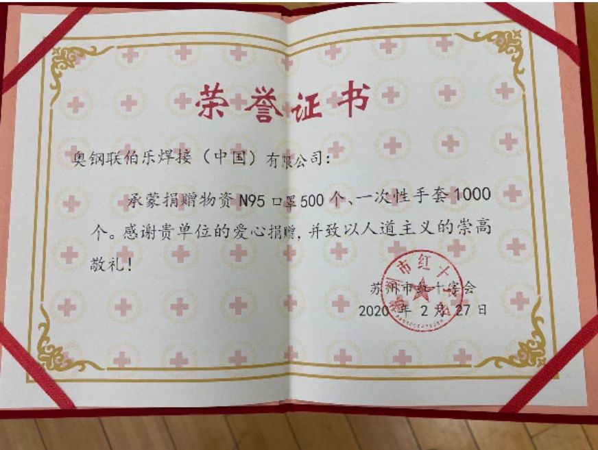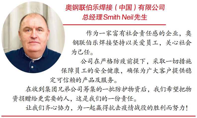 奧鋼聯(lián)伯樂焊接(中國)有限公司總經(jīng)理 Neil Smith先生說:作為一家富有社會(huì)責(zé)任感的企業(yè),奧鋼聯(lián)伯樂焊接堅(jiān)持以關(guān)愛員工,關(guān)心社會(huì)為己任。 公司在嚴(yán)格防疫前提下,采取一切措施保障員工的安全健康,確保為廣大客戶提供穩(wěn)定可信賴的產(chǎn)品及服務(wù)。在收到集團(tuán)兄弟公司籌集的一批防護(hù)物資后,我們希望把物資捐贈(zèng)給更需要的人,這是我們的一份責(zé)任。
