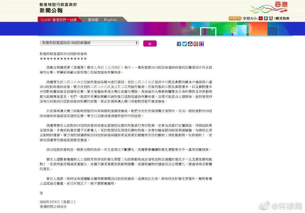 此前報(bào)道:漁護(hù)署于26日接獲衛(wèi)生署消息稱,一名新冠肺炎確診者的狗需交予漁護(hù)署處理。漁護(hù)署人員同日傍晚到大坑一住所接走這條狗,隨即送往港珠澳大橋口岸動(dòng)物居留所,并從其口腔,鼻腔及肛門抽取樣本進(jìn)行新型冠狀病毒測(cè)試。結(jié)果反應(yīng)其口腔及鼻腔的樣本在測(cè)試中呈弱陽性反應(yīng),但這條狗并無任何相關(guān)病征。