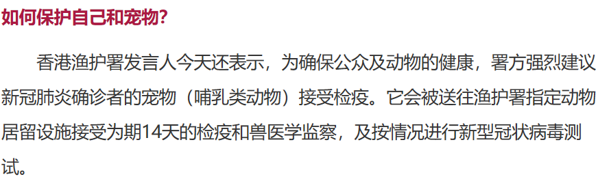 漁護(hù)署發(fā)言人表示,為確保公眾及動(dòng)物的健康,署方強(qiáng)烈建議新冠肺炎確診者的寵物(哺乳類動(dòng)物)接受檢疫。它會(huì)被送往漁護(hù)署指定動(dòng)物居留設(shè)施接受為期14天的檢疫和獸醫(yī)學(xué)監(jiān)察,及按情況進(jìn)行新型冠狀病毒測(cè)試。
