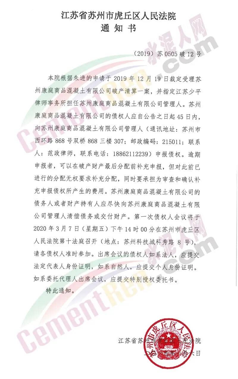 通知書(shū)稱(chēng):根據(jù)朱進(jìn)的申請(qǐng)于2019年12月19日裁定受理蘇州康庭商品混凝土有限公司破產(chǎn)清算一案 ,并指定律所擔(dān)任其管理人。蘇州康庭商品混凝土有限公司的債權(quán)人自公告之日起45日內(nèi)可申請(qǐng)債權(quán)。