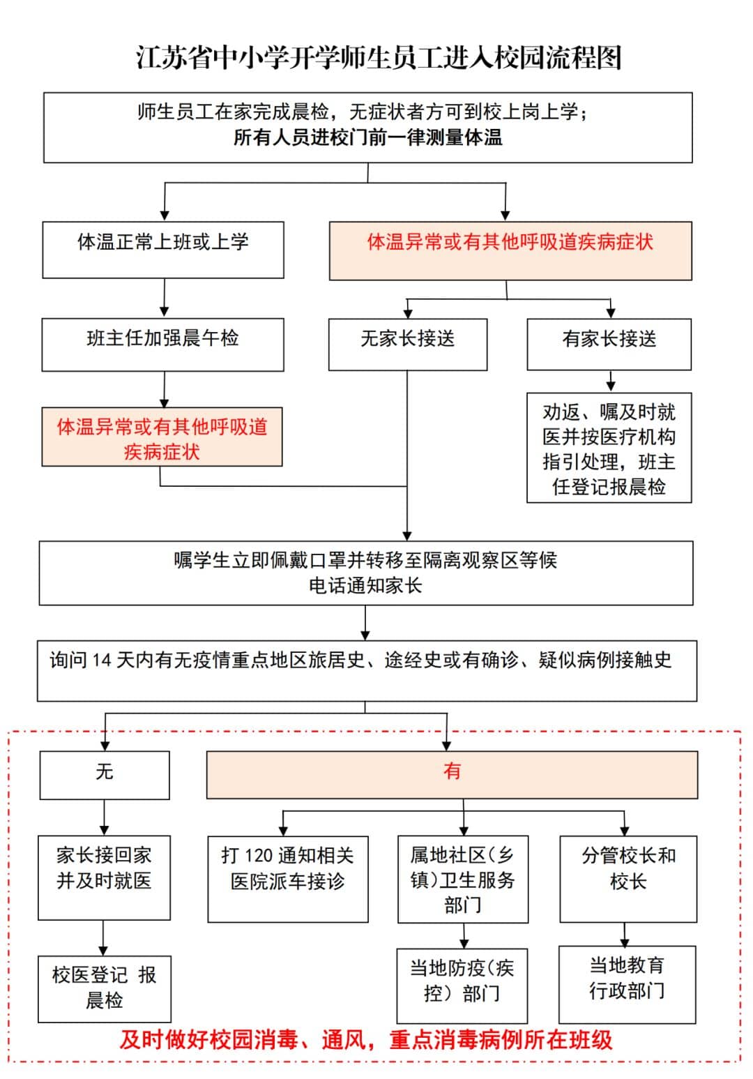 (十二)落實(shí)晨午檢制度。學(xué)校每日要以班級(jí)為單位進(jìn)行晨午檢(流程圖見(jiàn)文后),檢查本班學(xué)生出勤及健康情況;每天入校、離校(住校生晨起、午睡、晚寢)前,教師分工定人檢查學(xué)生健康狀況并做好記錄,學(xué)校匯總后向?qū)俚亟逃块T(mén)報(bào)告。如發(fā)現(xiàn)有疑似新冠肺炎早期癥狀(如發(fā)熱、乏力、干咳、腹瀉等)和異常情況的,立即啟動(dòng)應(yīng)急預(yù)案,做好以下幾方面應(yīng)對(duì)措施: