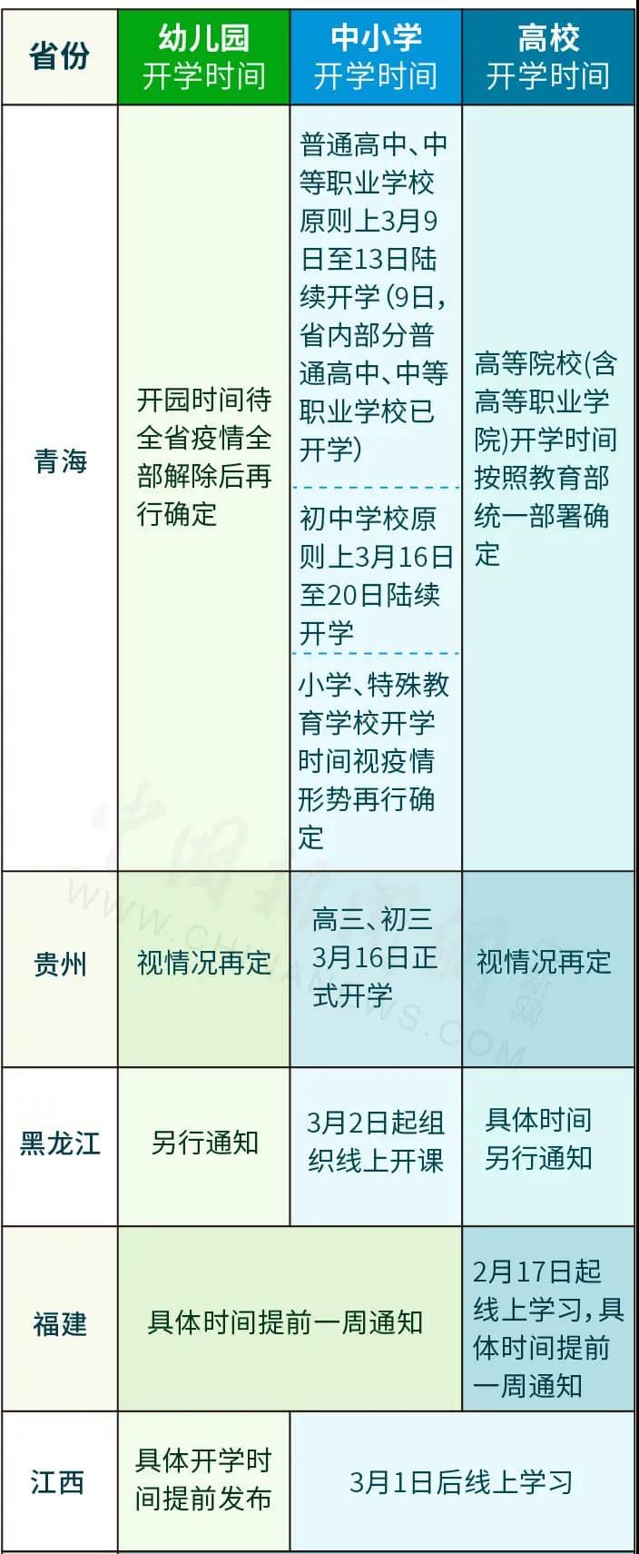 例如,2月27日,貴州省委、省政府研究確定:該省高三年級(jí)和初三年級(jí)學(xué)生3月16日正式開(kāi)學(xué),其他學(xué)段、高中初中其他年級(jí)開(kāi)學(xué)時(shí)間將視下一階段疫情防控情況,經(jīng)科學(xué)評(píng)估后再行確定并向社會(huì)公布。