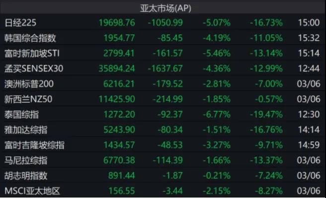 亞太股市方面,日經(jīng)225指數(shù)大跌超5%以上,刷新2019年1月初以來低位。越南股市擴大跌幅至6.2%,創(chuàng)2001年10月以來最大跌幅。
